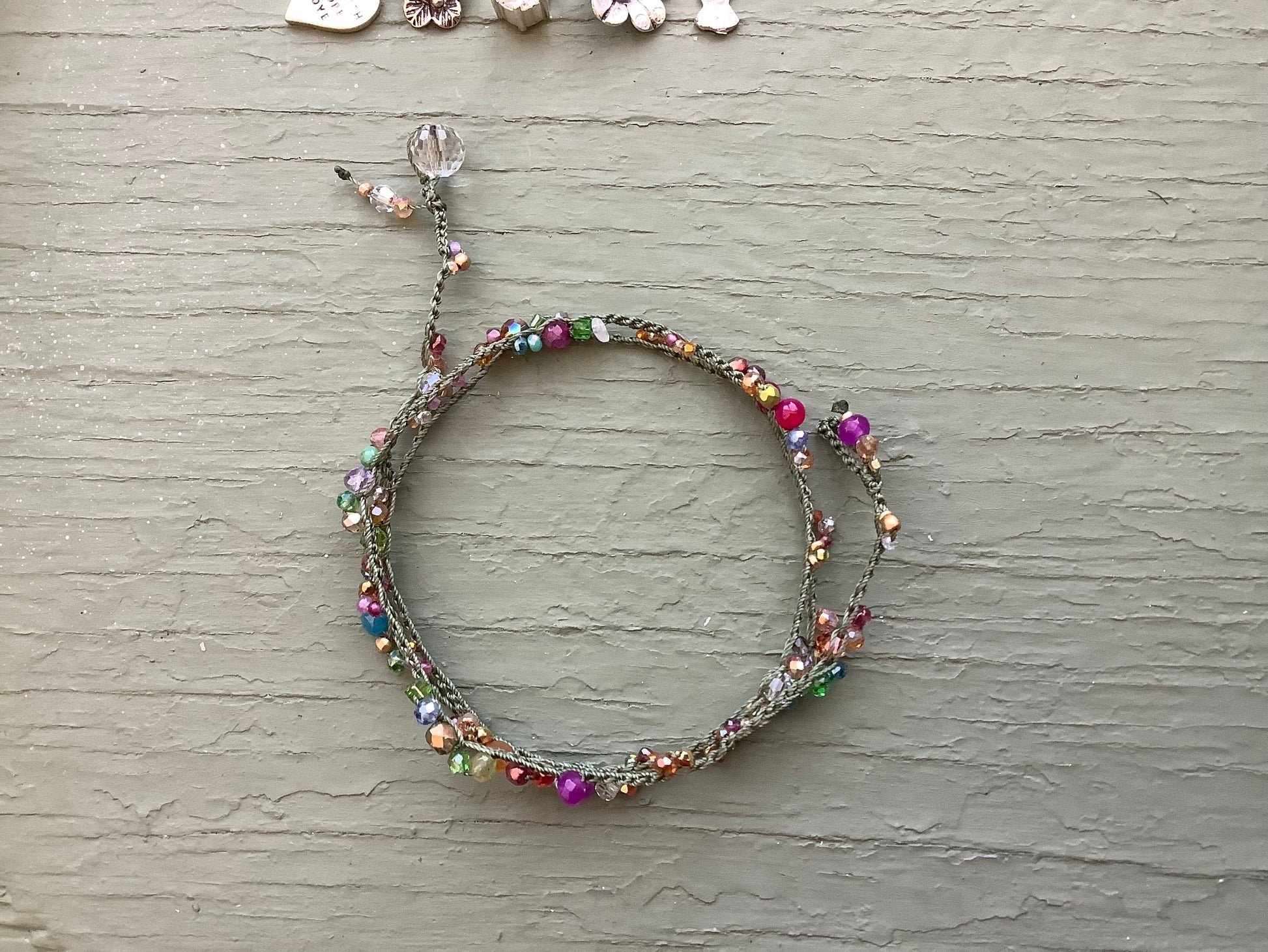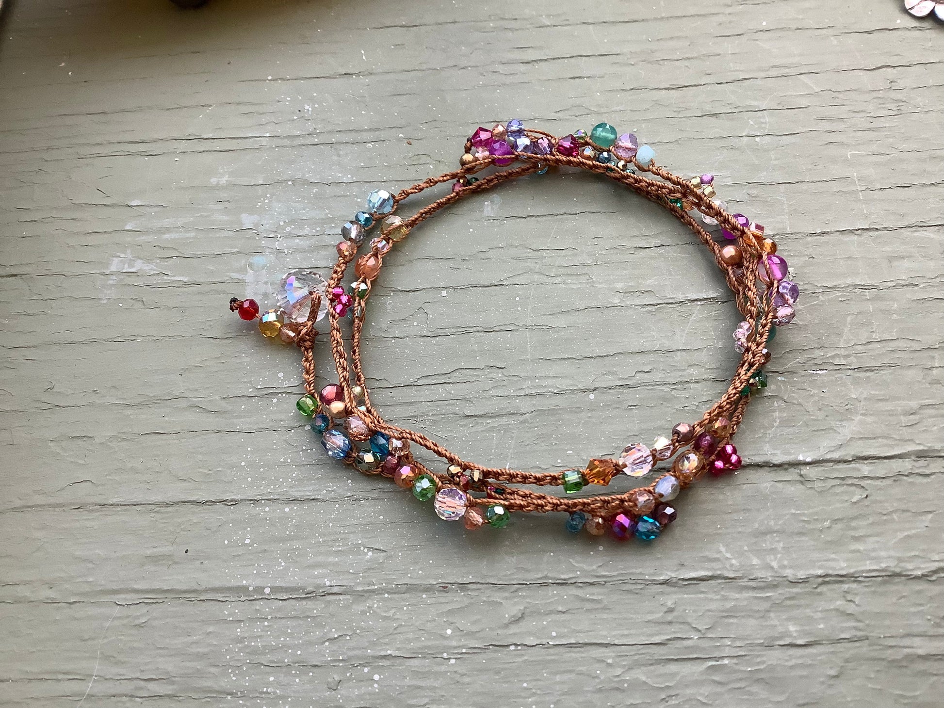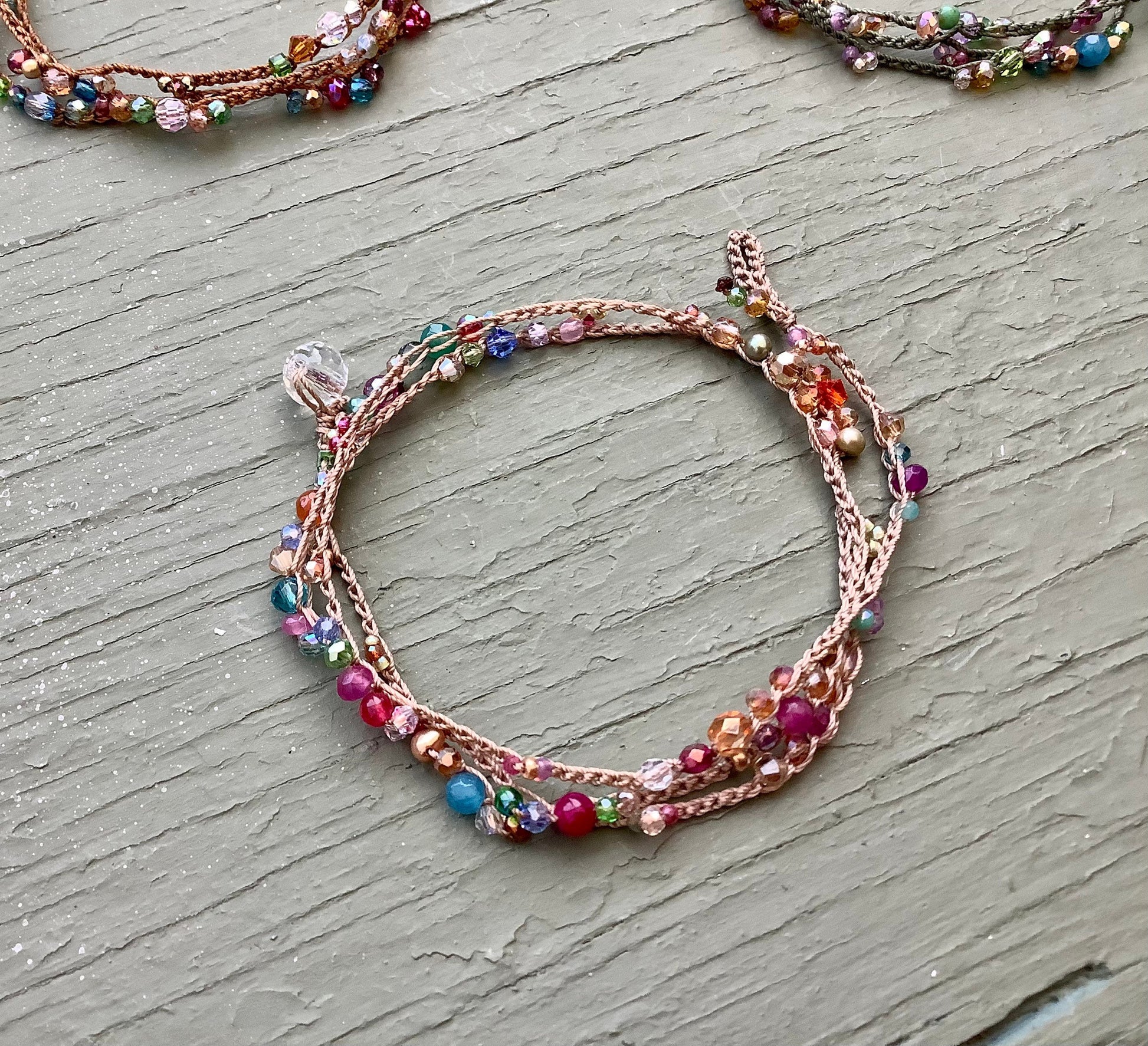 I loved making this one because I love the colors, mixed with ruby, jade, agate, and a few Swarovski crystals together and then crocheted into clusters … it looks like flowers on a vine.. this is a triple wrap bracelet - approximately 22” inches..