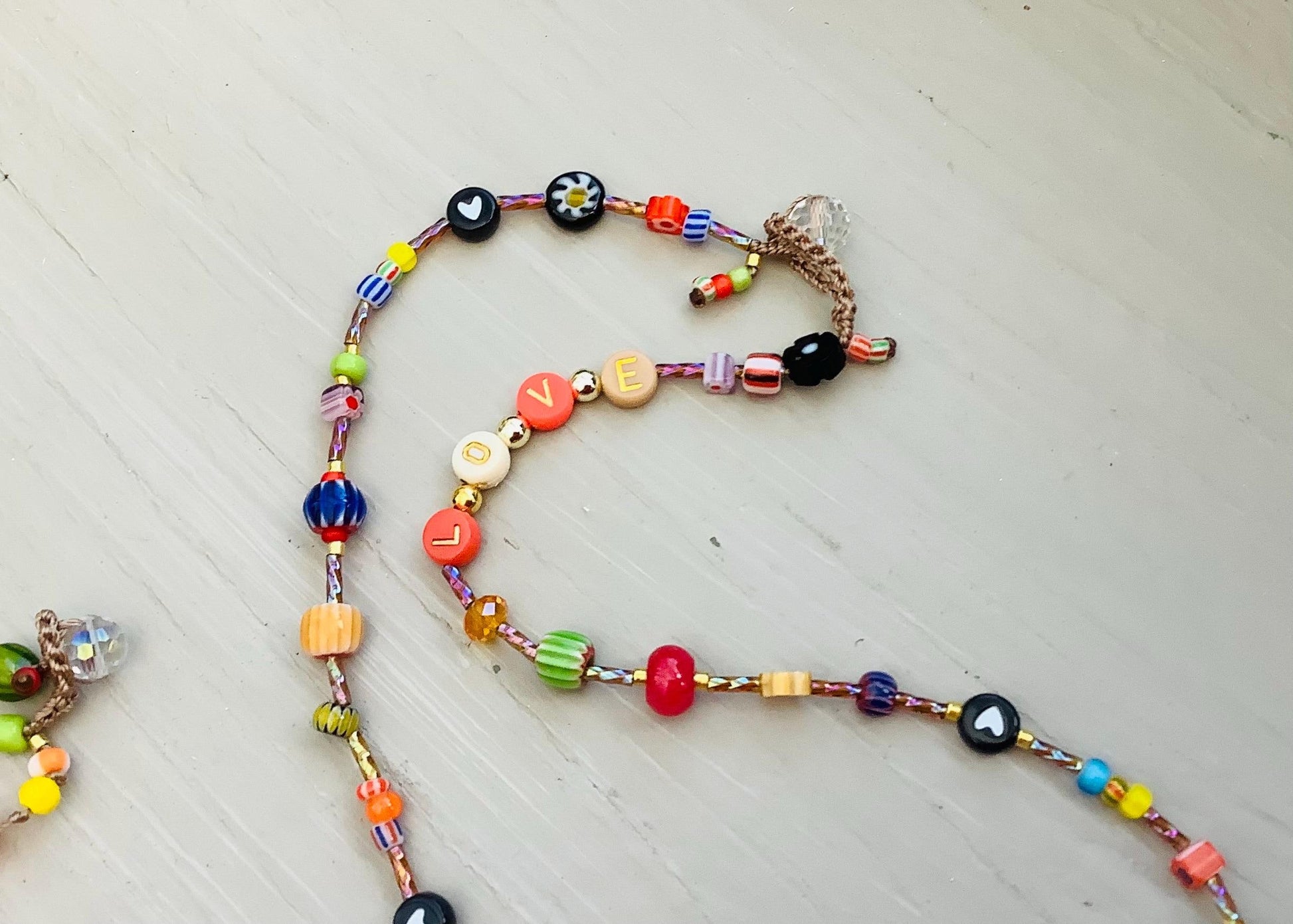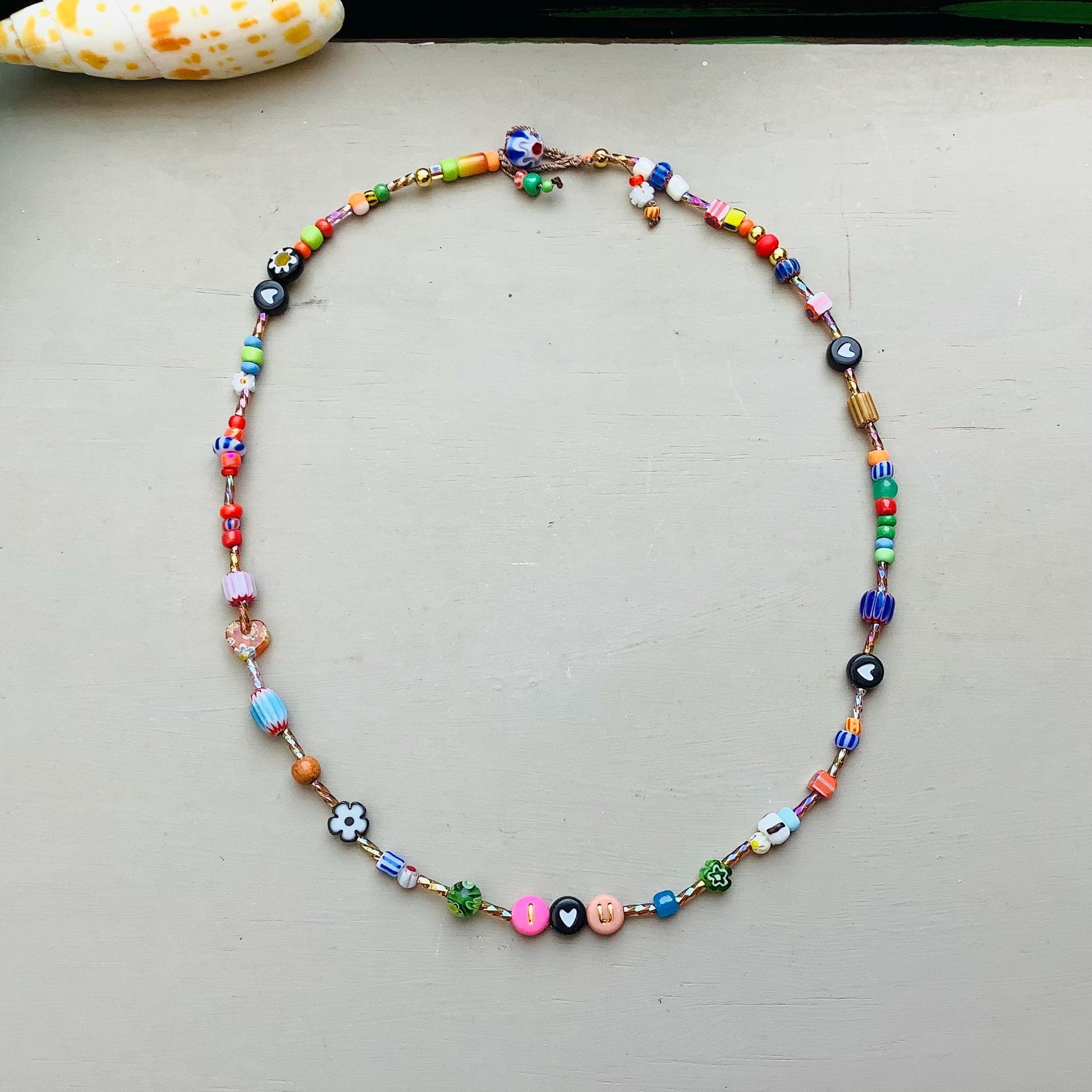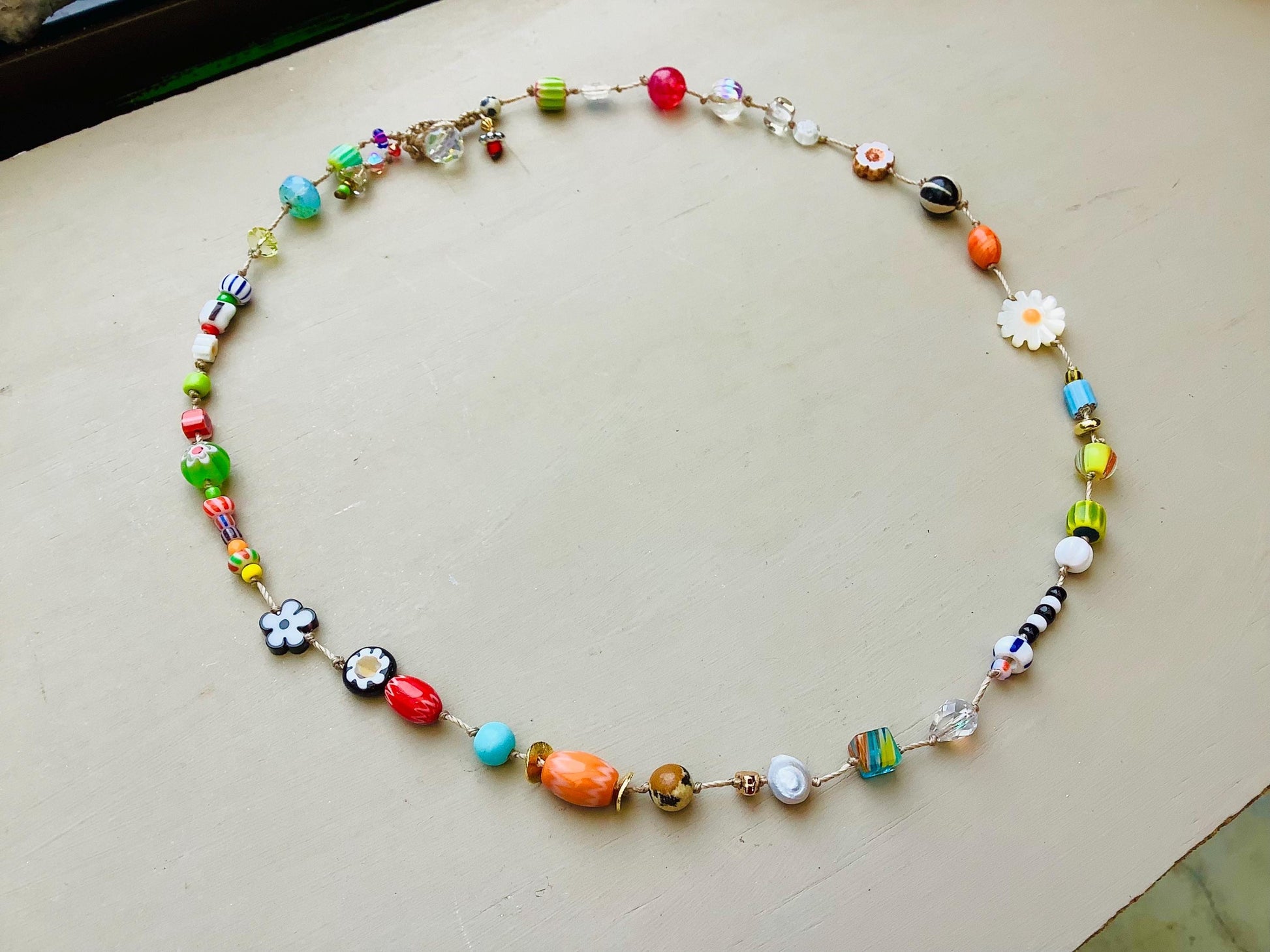 This necklace was so fun to make, strung with a variety of different bright beads, some with glass tubes in between, some knotted, beads are specialty Venetian Ghana Beads, gemstones, glass, crystals, I can also put letters in your necklace if you’d like..