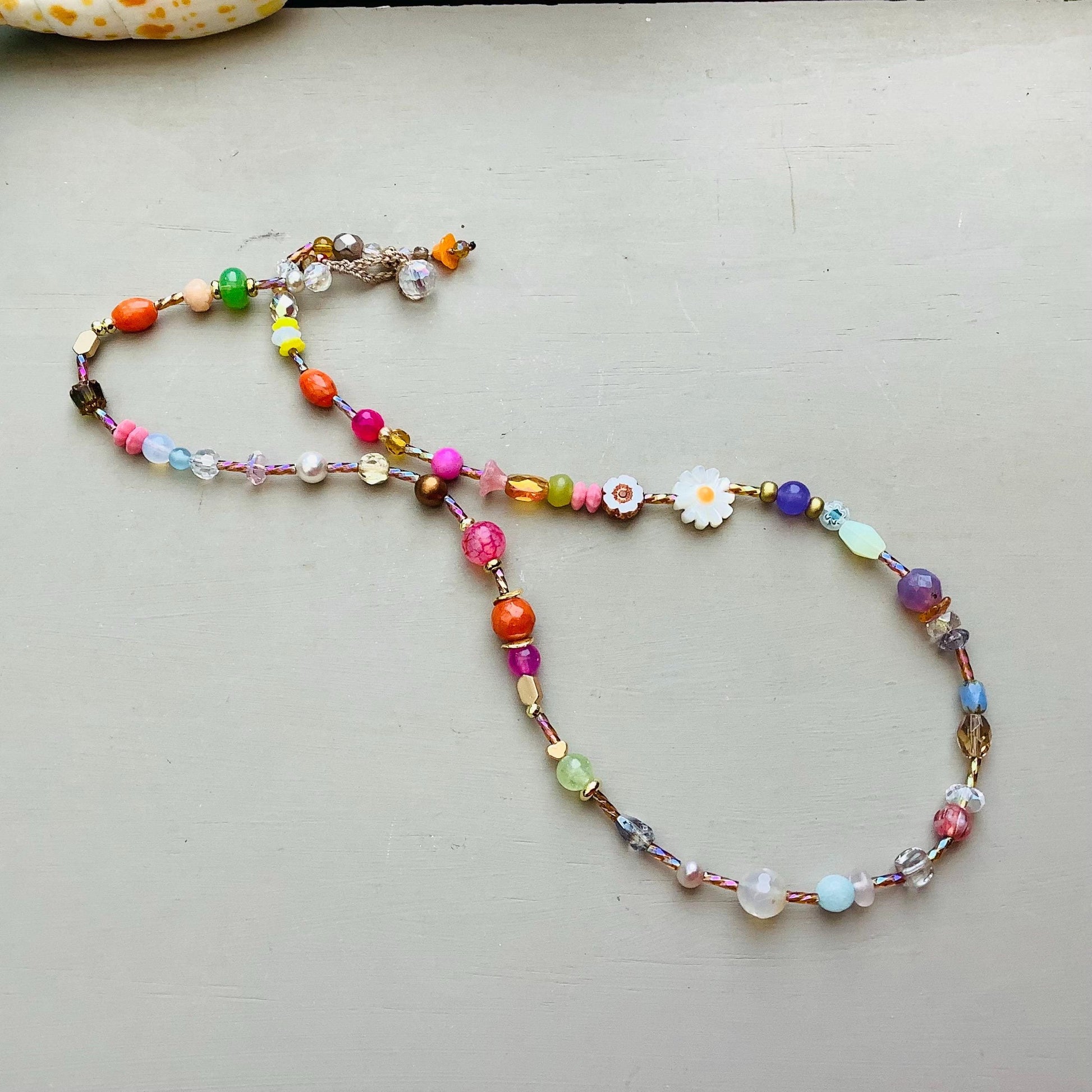 its strung on a cotton/nylon cord, it closes with a strong crocheted loop and crystal closure with a flower dangle at the back.. its a fun little necklace that goes with just about anything! each one is unique and different.. please choose if you want 18 to 19 inches or longer 38 inches