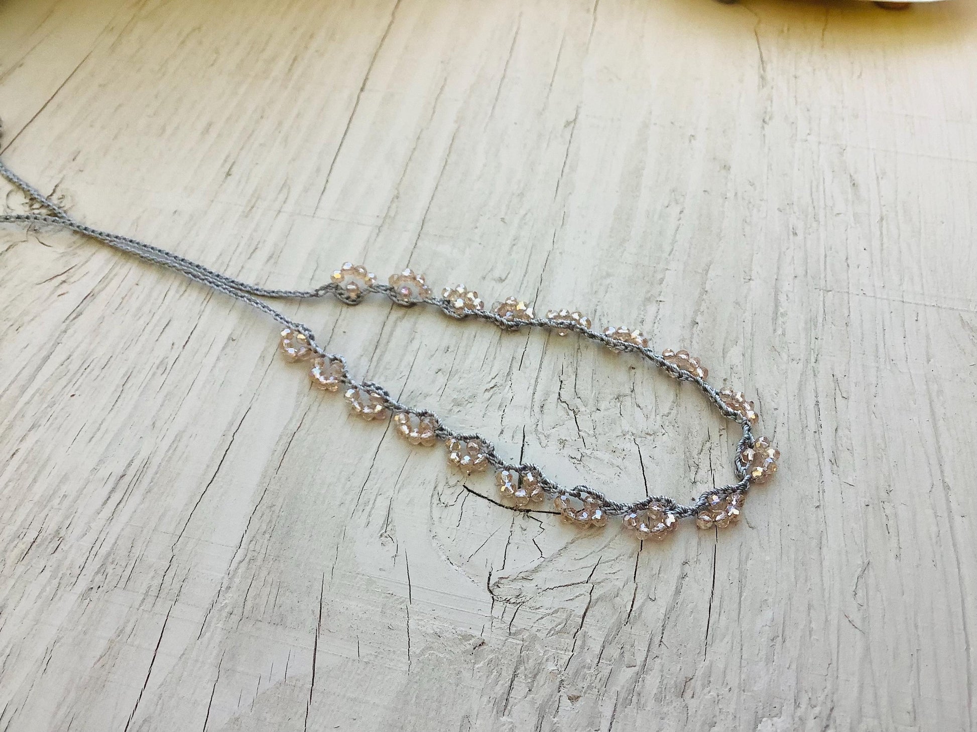 New lace crochet necklace style it’s a Turkish style of crochet, .. its crocheted on grey cord with very tiny champagne colored crystals, can be made any length.. this one is 18 to 19 inches..😀 I can also use any color cord.