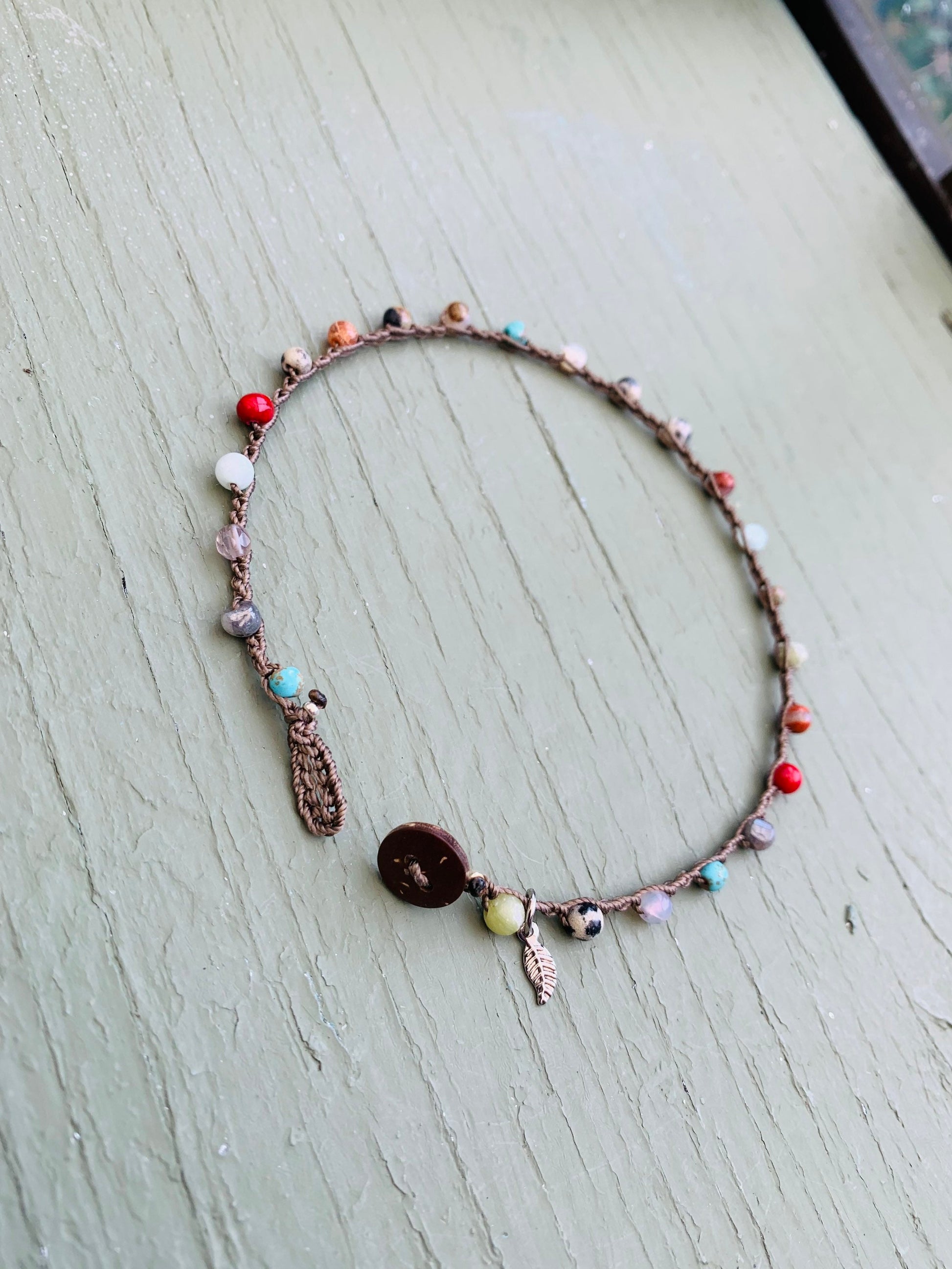 This anklet is hand crocheted with dalmatian jasper and red jasper, and a little bit of turquoise and lava stone, agate jades and carnelian on a strong cord.. Bead and stone placement will be unique to each anklet.. Standard size is approx 9- 10" ** IF you require a different size please let me know it will be made whatever size you chose... thank you !