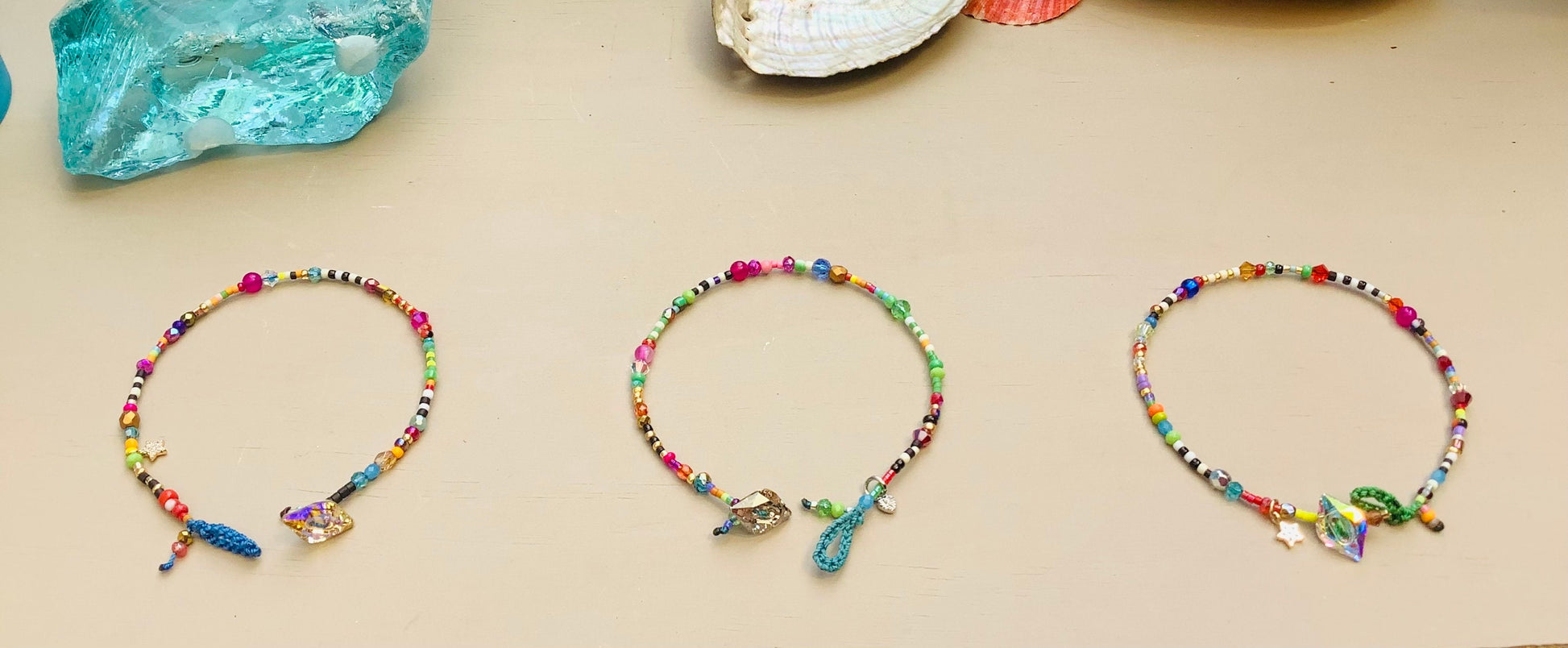 I used tiny high quality toho and delica beads dotted with gems and crystals, (2MM-4MM) also swarovski and Czech crystals, on bright green cord, with a tiny gold rhinestone star, and sooo pretty swarovski button its approx 7.5” 🌹 Copyright 2019