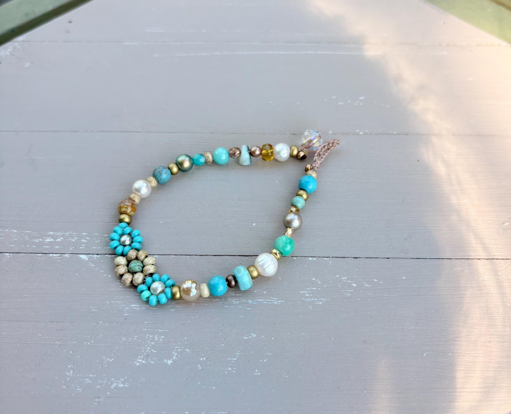 This bracelet is made with turquoise, gold beads, pearls, crystal and glass beads with woven in flowers , it’s strung on a latte colored cord with a cute rhinestone charm, Size is approximately 7.5” inches if you require a different size please let me know and “notes to seller” upon check out and I will make it for you..