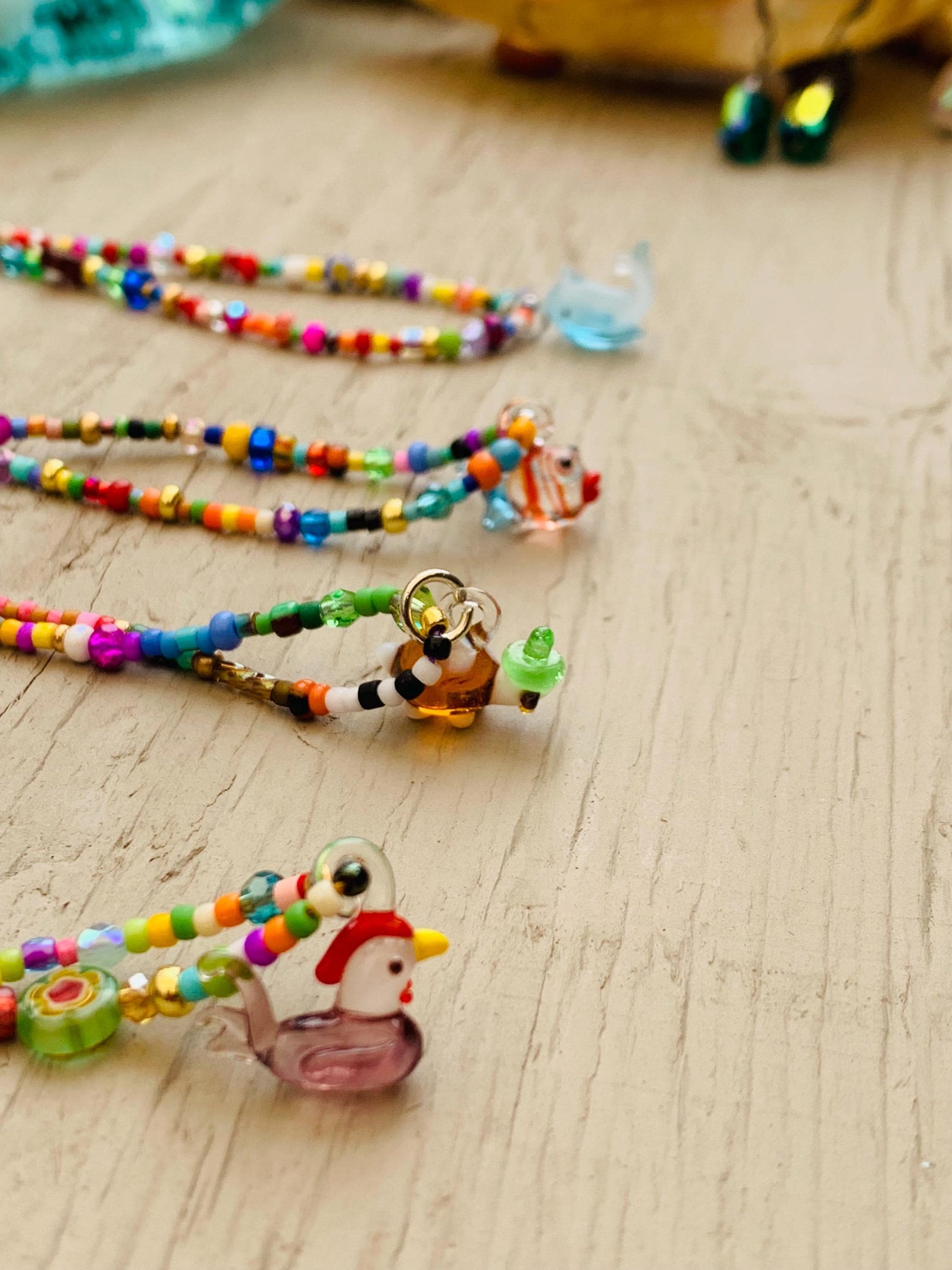 NEW super cute Colorful seed bead necklaces for kids .. with hand blown glass pendants, or the pendant of your choice, please see last pics to choose a different one Each necklace is approximately 16” with a little mother of pearl button.