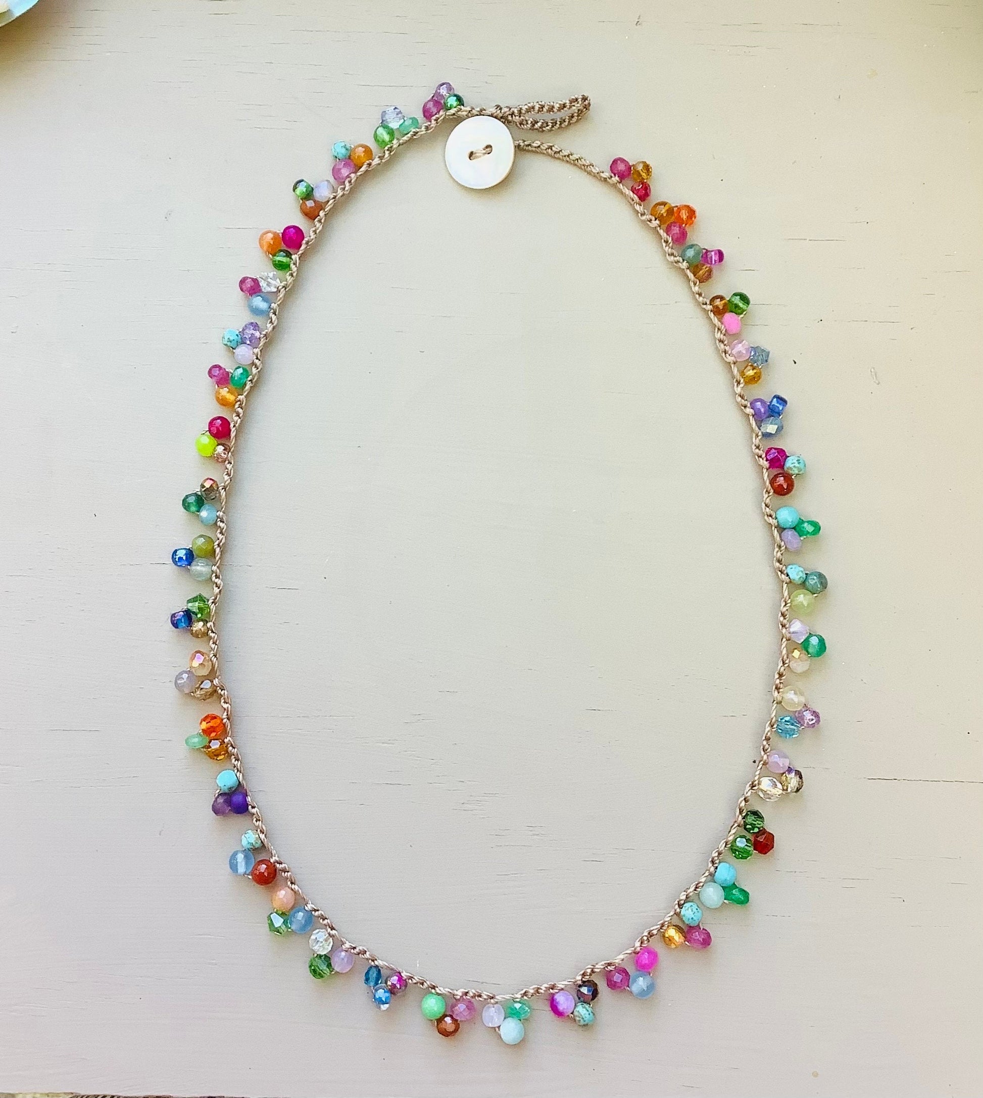 This Lacy boho natural crocheted necklace is one of my first designs when I opened my shop in 2007, closes with a natural mother of pearl button super pretty lacy design you can also choose - multicolour, mother of pearl , turquoise , silver