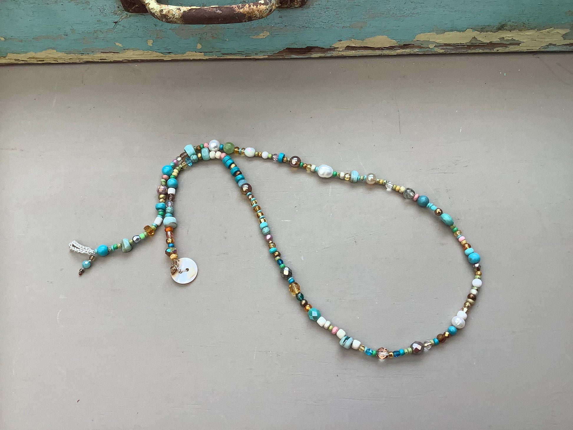These two necklaces go so beautifully together , sold separately there is one colour way of the blues with pearls , it is approximately 20 inches, It is strung on a latte colored cord.