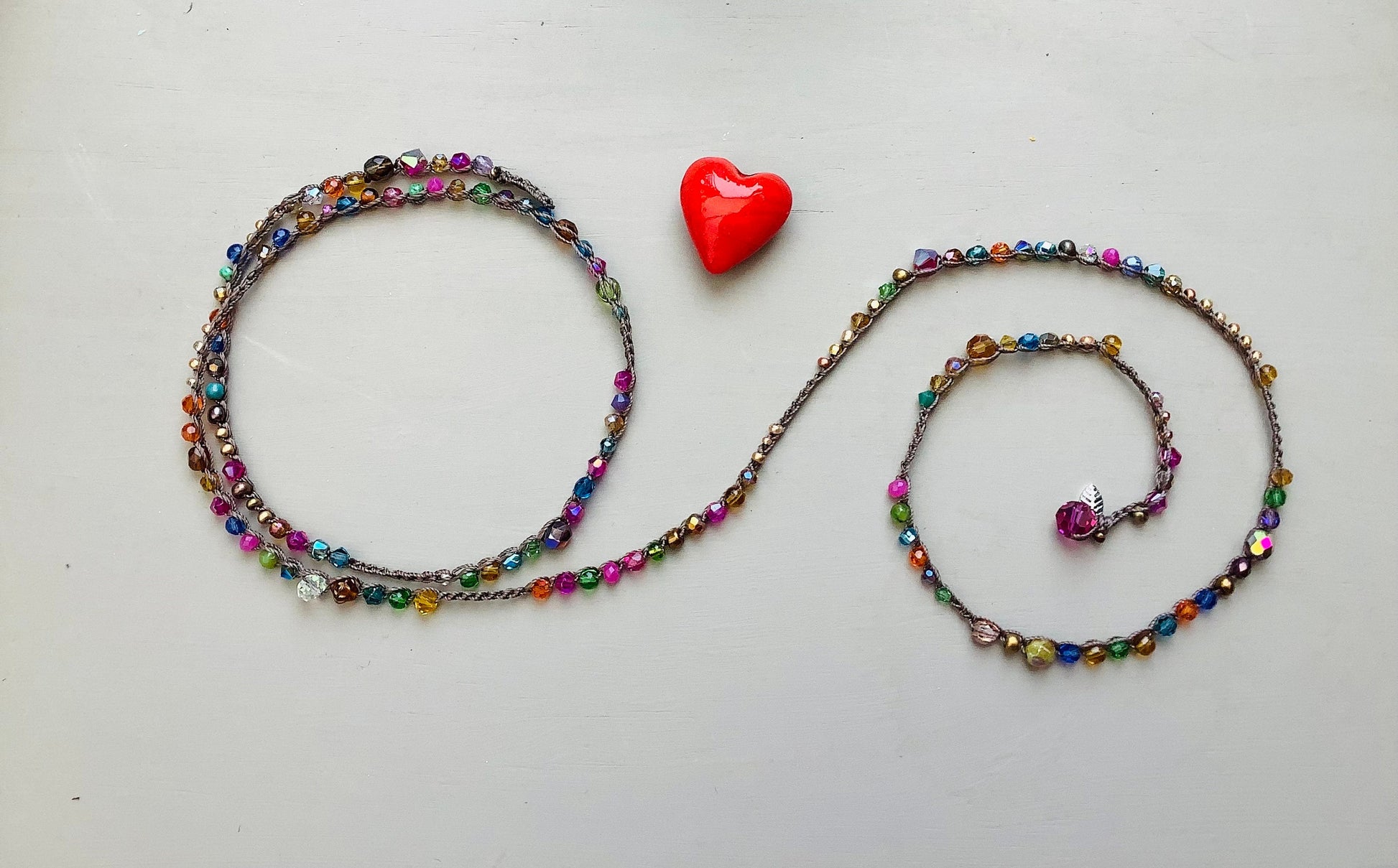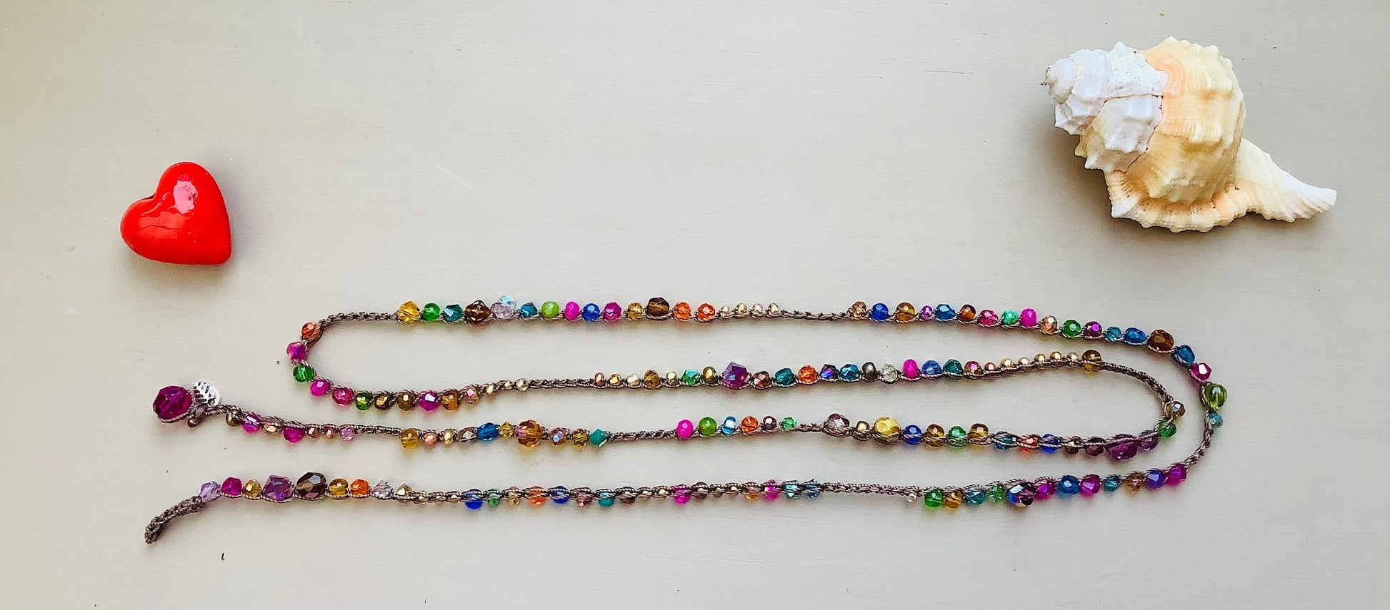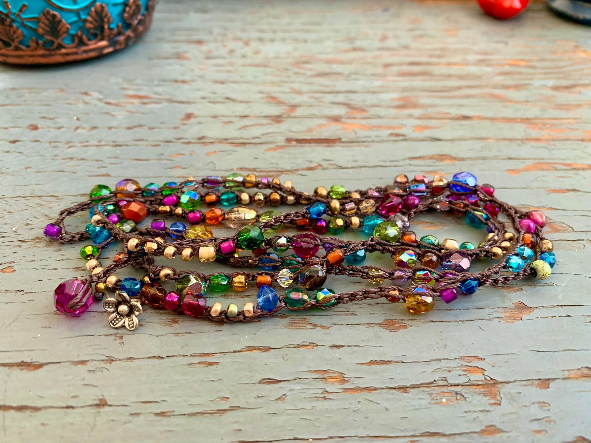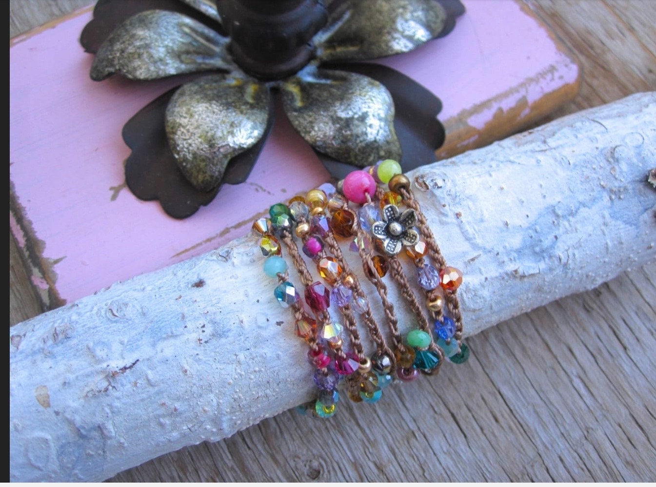 This wrap is crocheted on a chocolate brown cord, with swarovski and czech crystals .. blues, greens with bits of 14k gold seed beads and splashed of hot pink .. it’s one of my favorite color mixtures.. I love the rich gem tones and the colors of the crystals . ~ wraps around your wrist 4 times. Approx 30” long based on a 7 inch wrist, please let me know if you need another size .. I can make any size can also be made in latte colored cord, please see last 2 pictures Comes with a pretty silver leaf or flower Thank you for coming by my shop