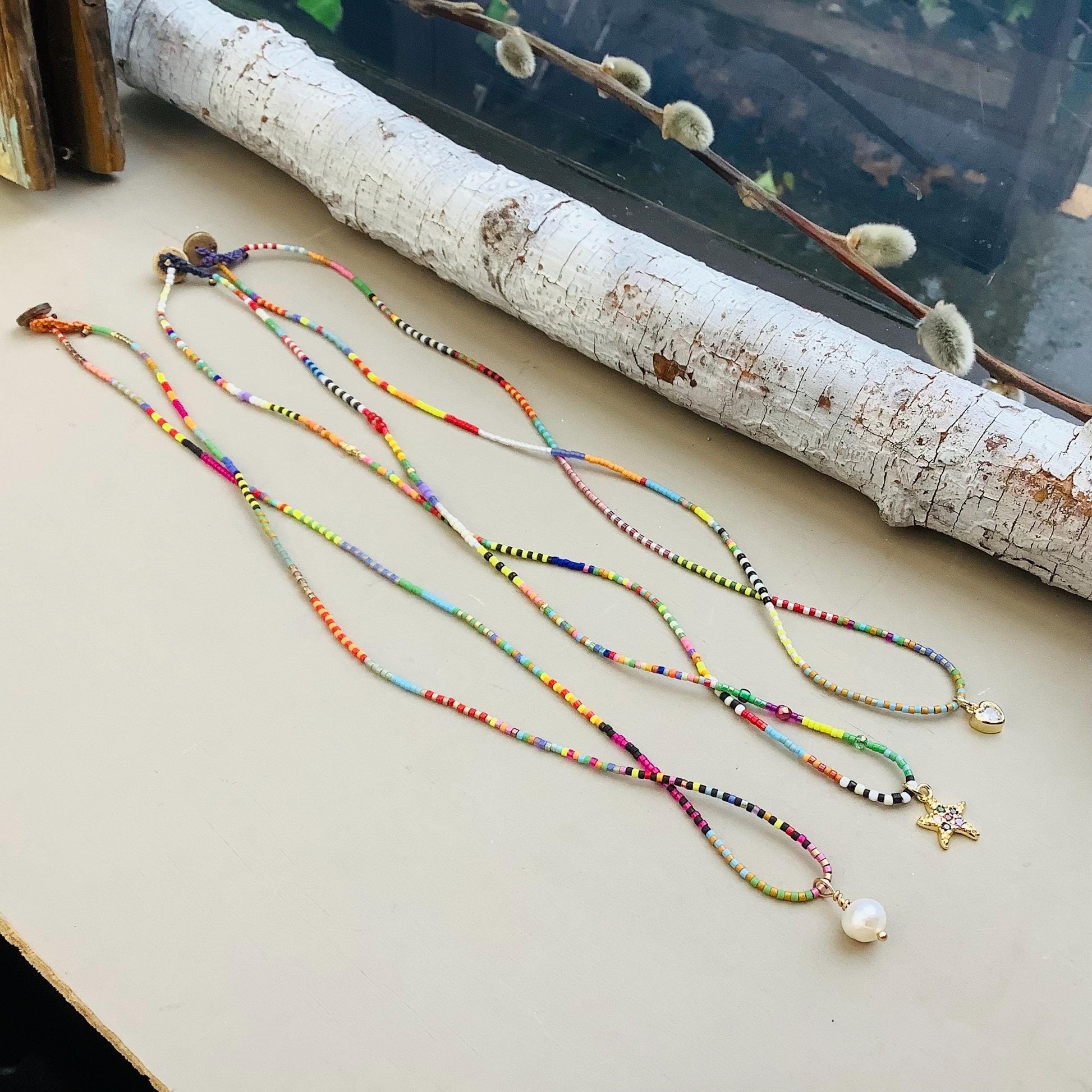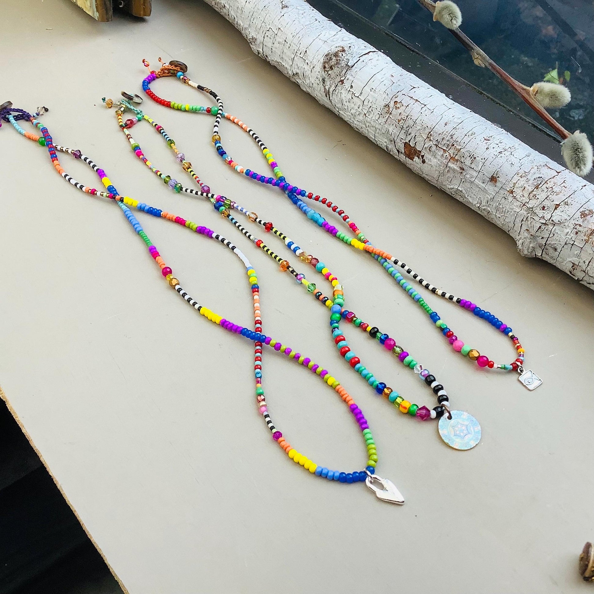 Please choose upon checkout - -multicolour striped -neural tones I’ve placed pendants on them, but you can choose any pendant you like on any necklace.