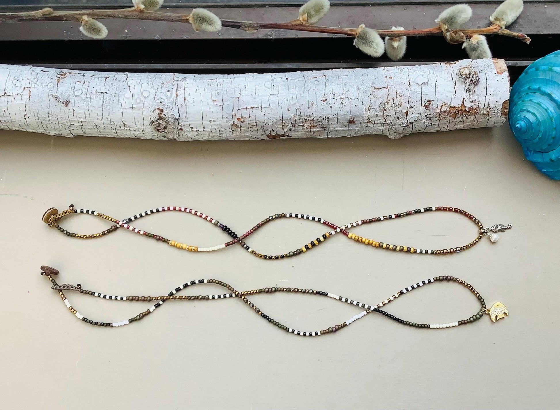 These necklaces are made with delicate glass delica and Toho beads, and some have the gemstone or crystal ... they are lovely little glass cylinders, (very tiny 2mm-3mm) in beautiful colors, they make such a cute necklace! I made them approx about 21 inches but can be made any length