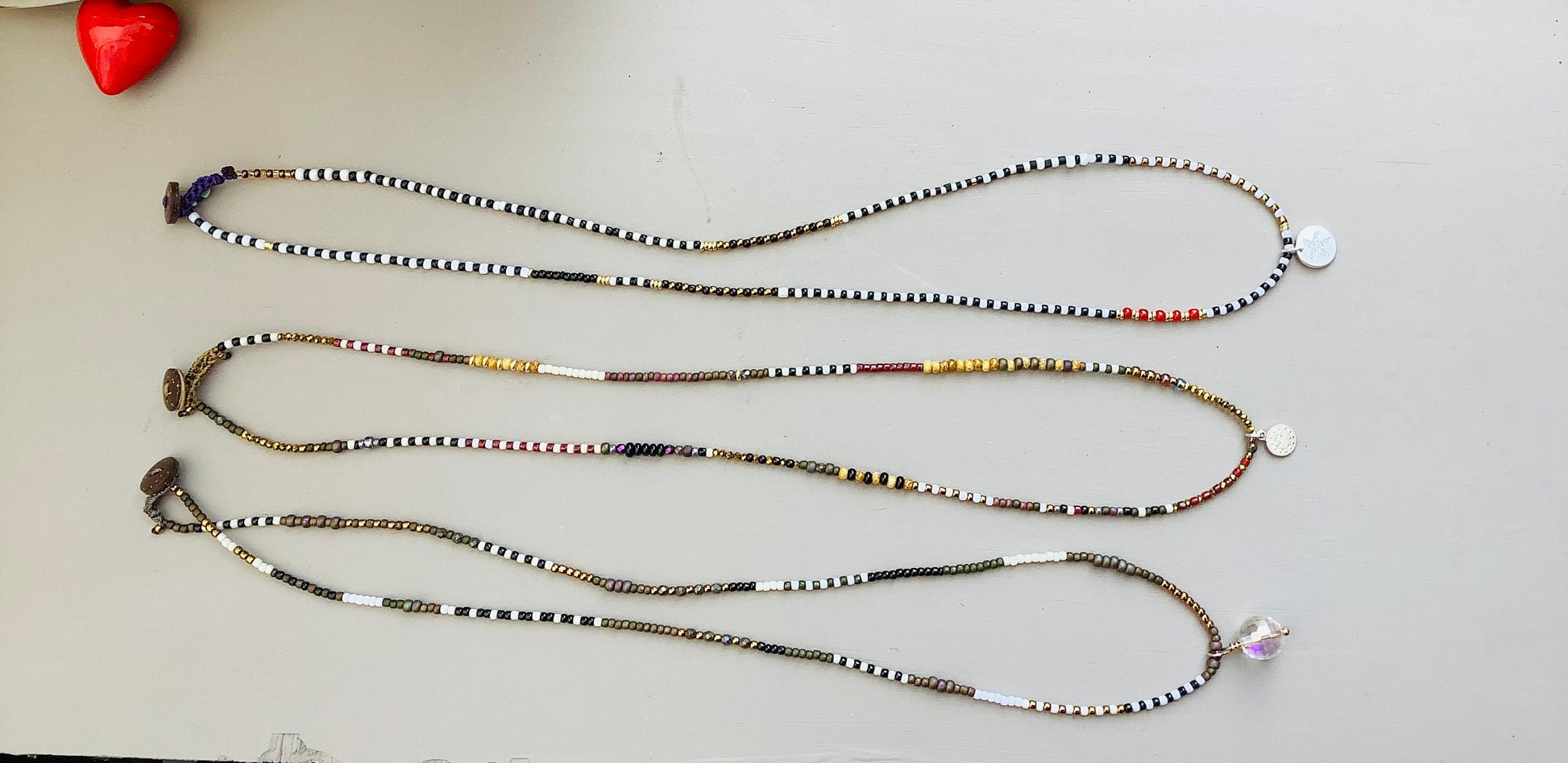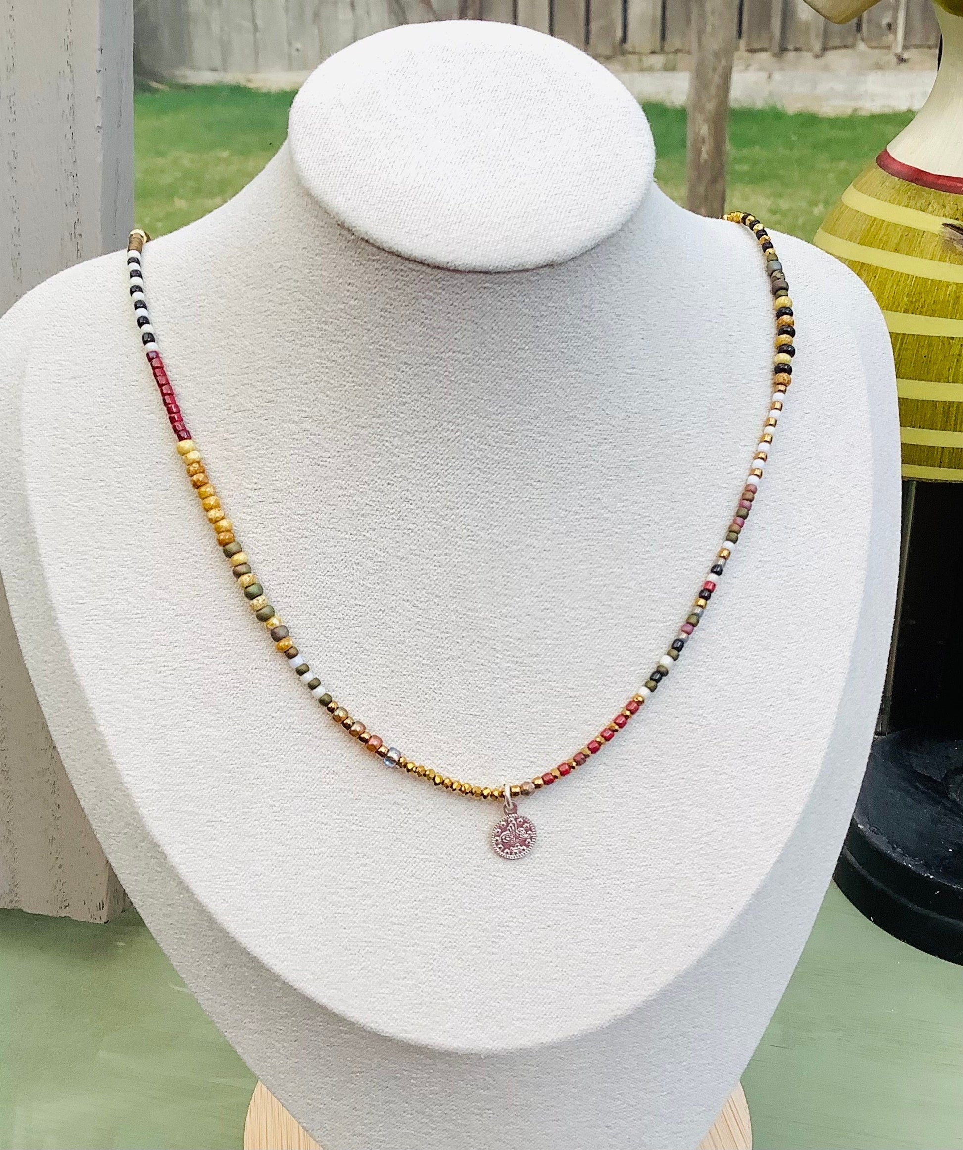 I love love these delicate tiny beads, they are made with many glass delica/toho beads (top quality beads) in stripes with a small splash of color, approx 19” with coconut carved button closure or choose a pendant or no pendant at all… I have many pendants please ask if you don’t see what you like ..