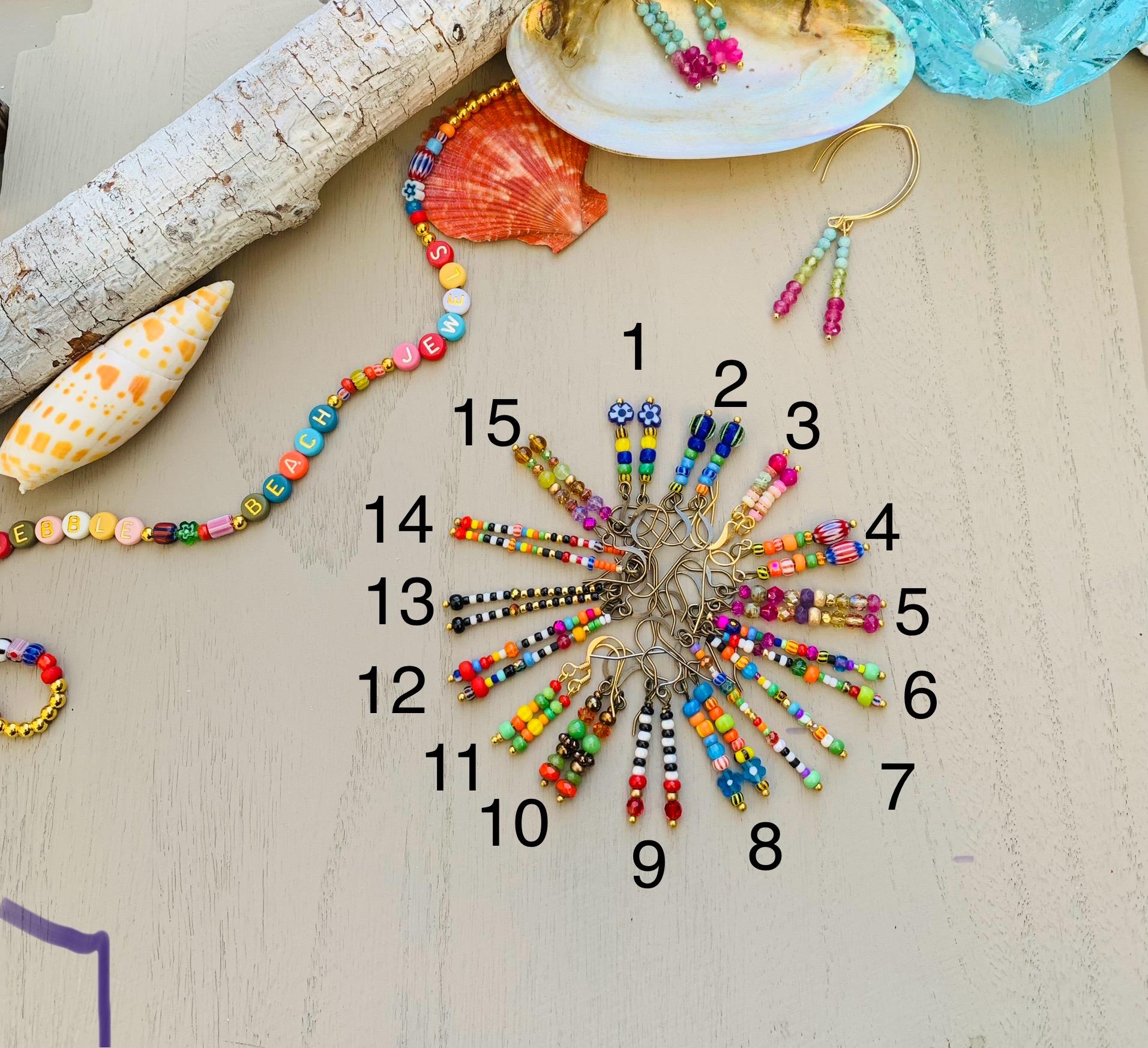 These earrings are made with Togo and delica beads ( tiny cylindrical glass beads) some crystals and gems in stripes they vary in length from approx 3/4- 1 - 1.5 inches Please choose from the photo with the numbers for your choice 😀 Super fun to wear with my Rio, anklets or many other designs