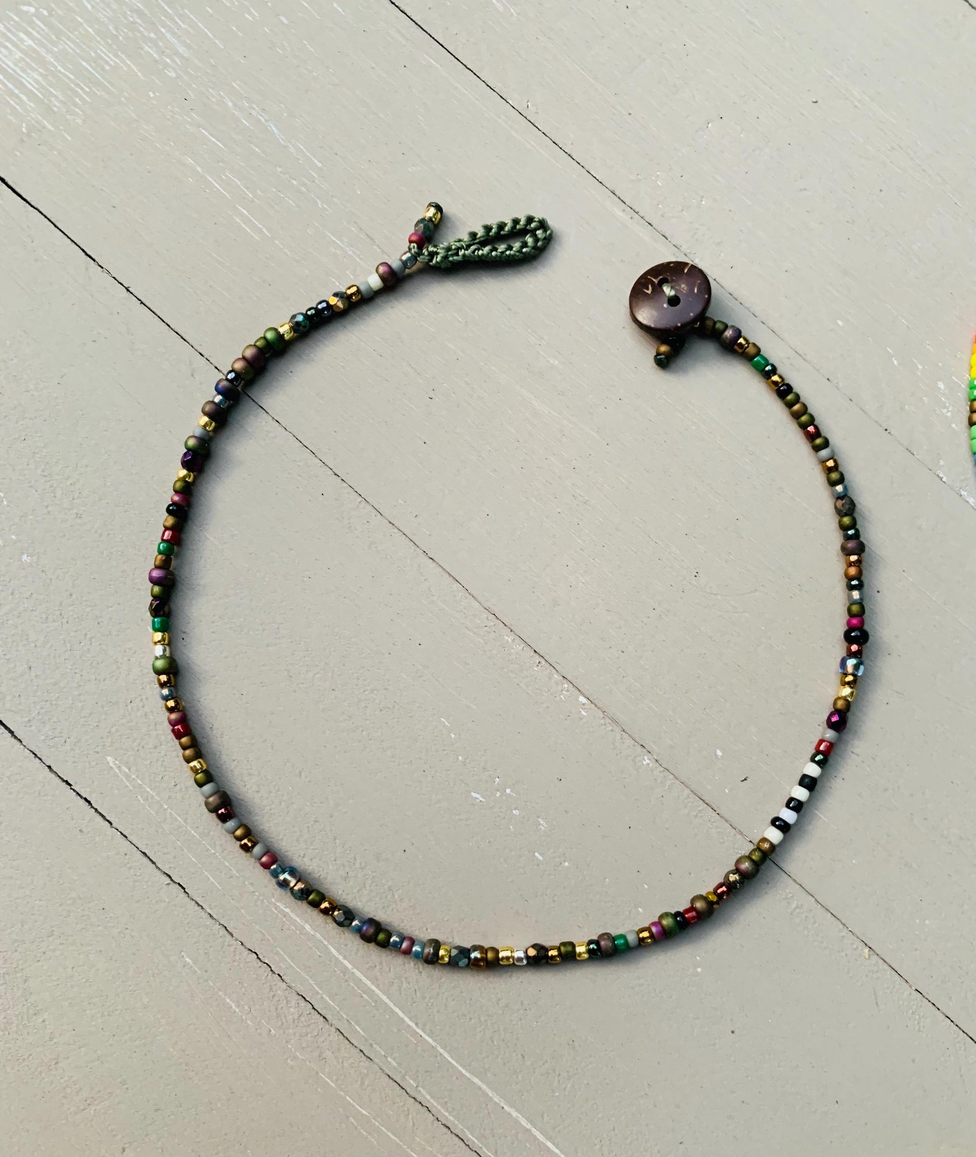These anklets are made with super tiny petite Toho and delica beads.. choose either neutral shade or colorful, finished with a carved coconut button, fun to wear anytime, strung on strong cord with coconut button and loop closure