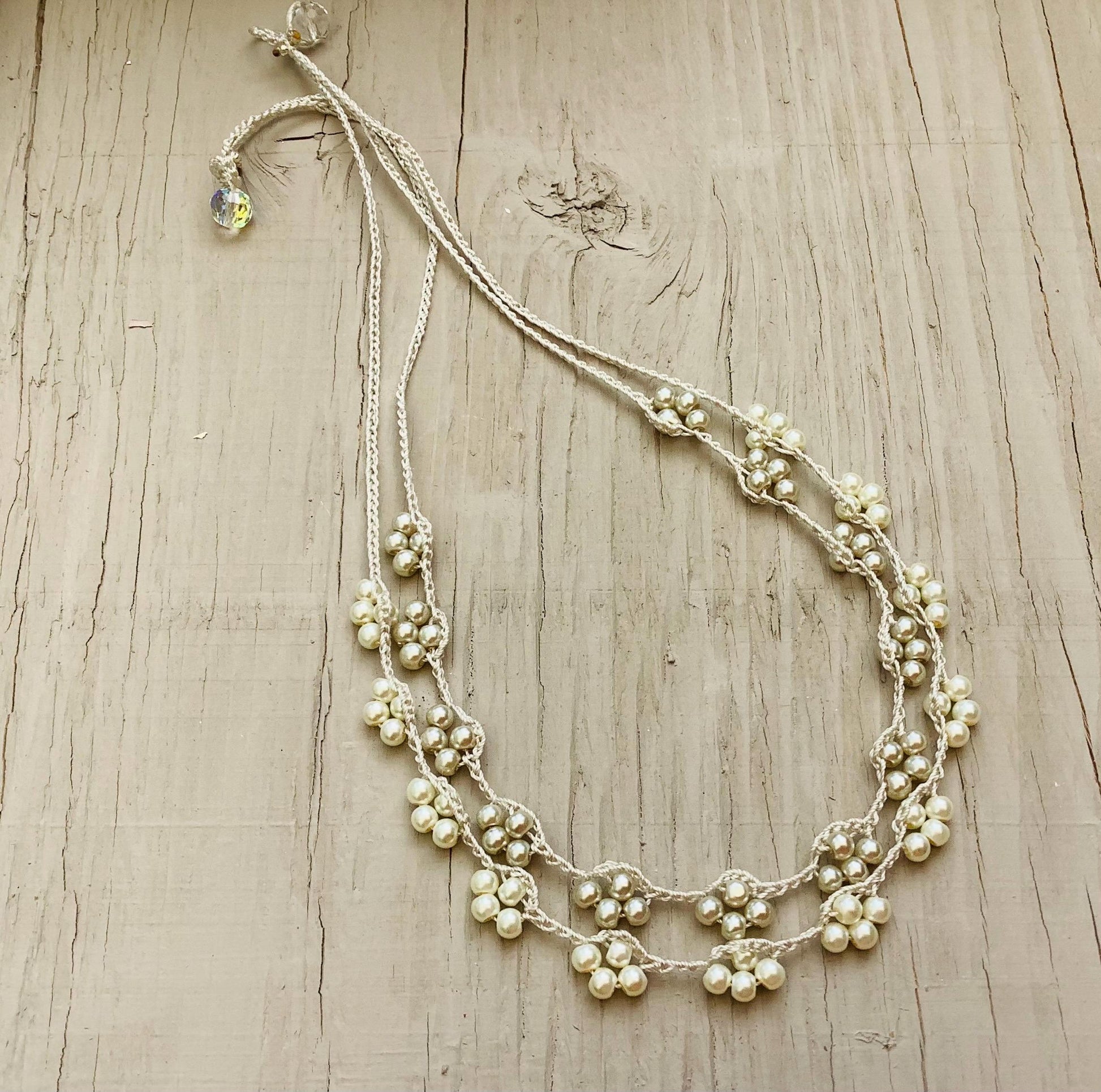 Turkish Lace Crocheted Necklace: Mother of Pearl, Crystal, Oya Style