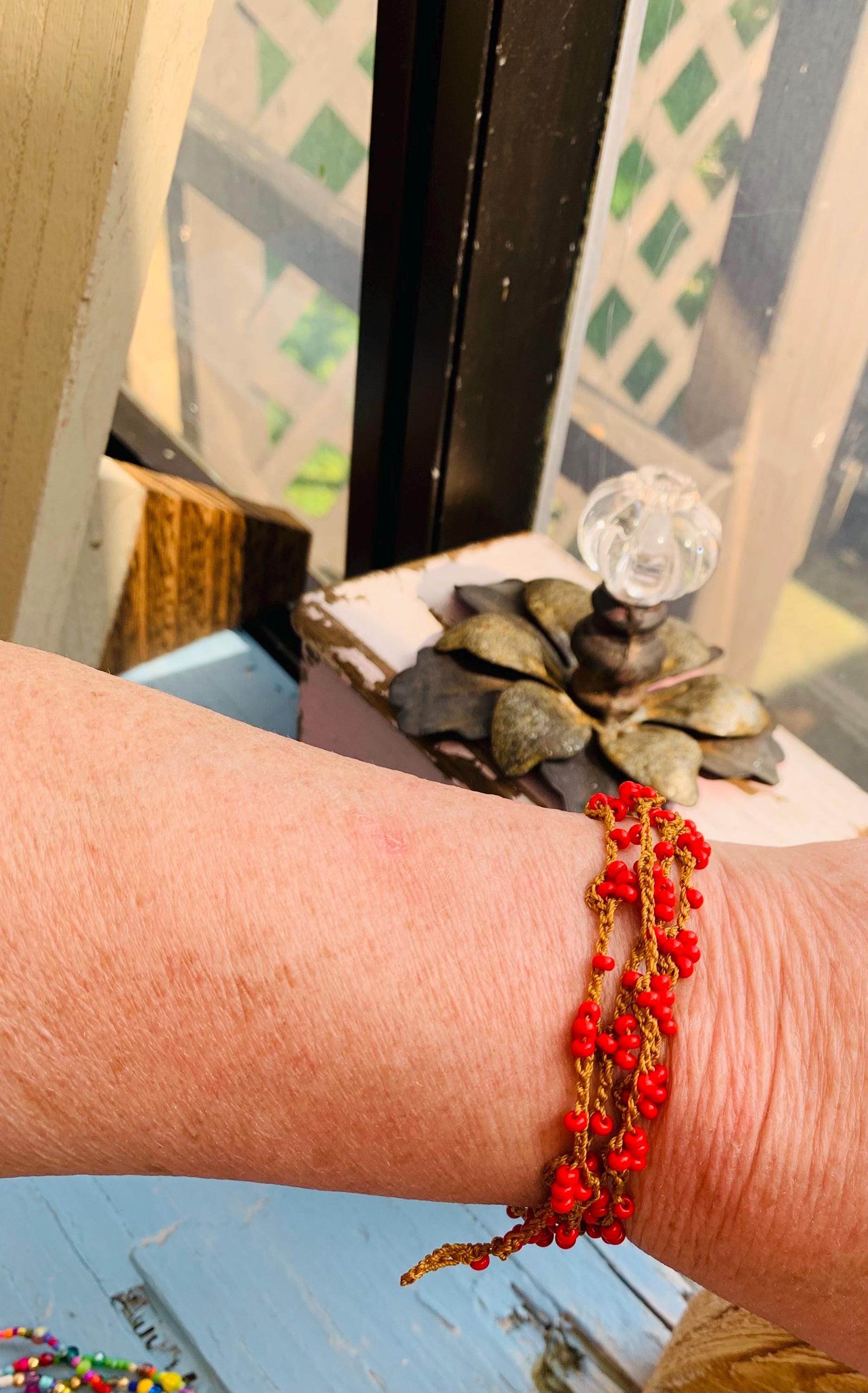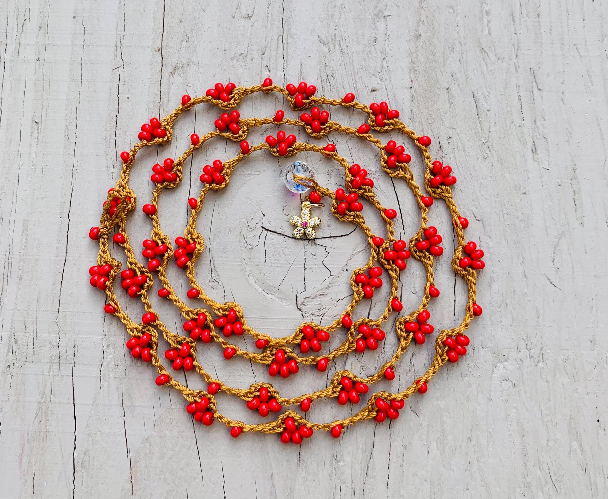 This necklace is made in a Turkish style of crochet, on a chestnut coloured cord with red seed beads crocheted into a lacy pattern, it looks so pretty on as a necklace or a bracelet, it wraps 4 times around your wrist.. The necklace is approximately 31 inches but I can make it any length you like .. .. - finished with a sparkly crystal clasp and cubic zirconia flower if you would like a different size please choose size upon checkout, thank you for looking at my shop🌹 *